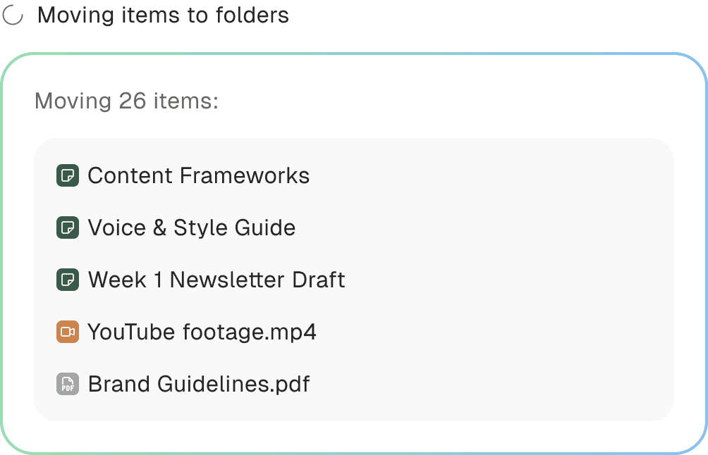 Draft posts, repurpose recordings, write briefs, or build out an entire email sequence from your actual content, not a blank prompt.
