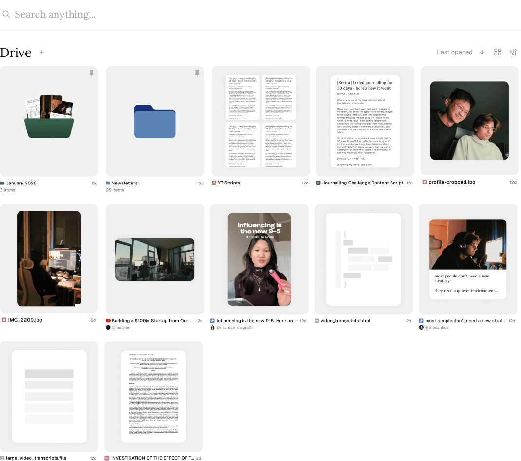 ChatGPT doesn't have your files. Notion doesn't ingest video. Google Drive doesn't have AI that does work for you.