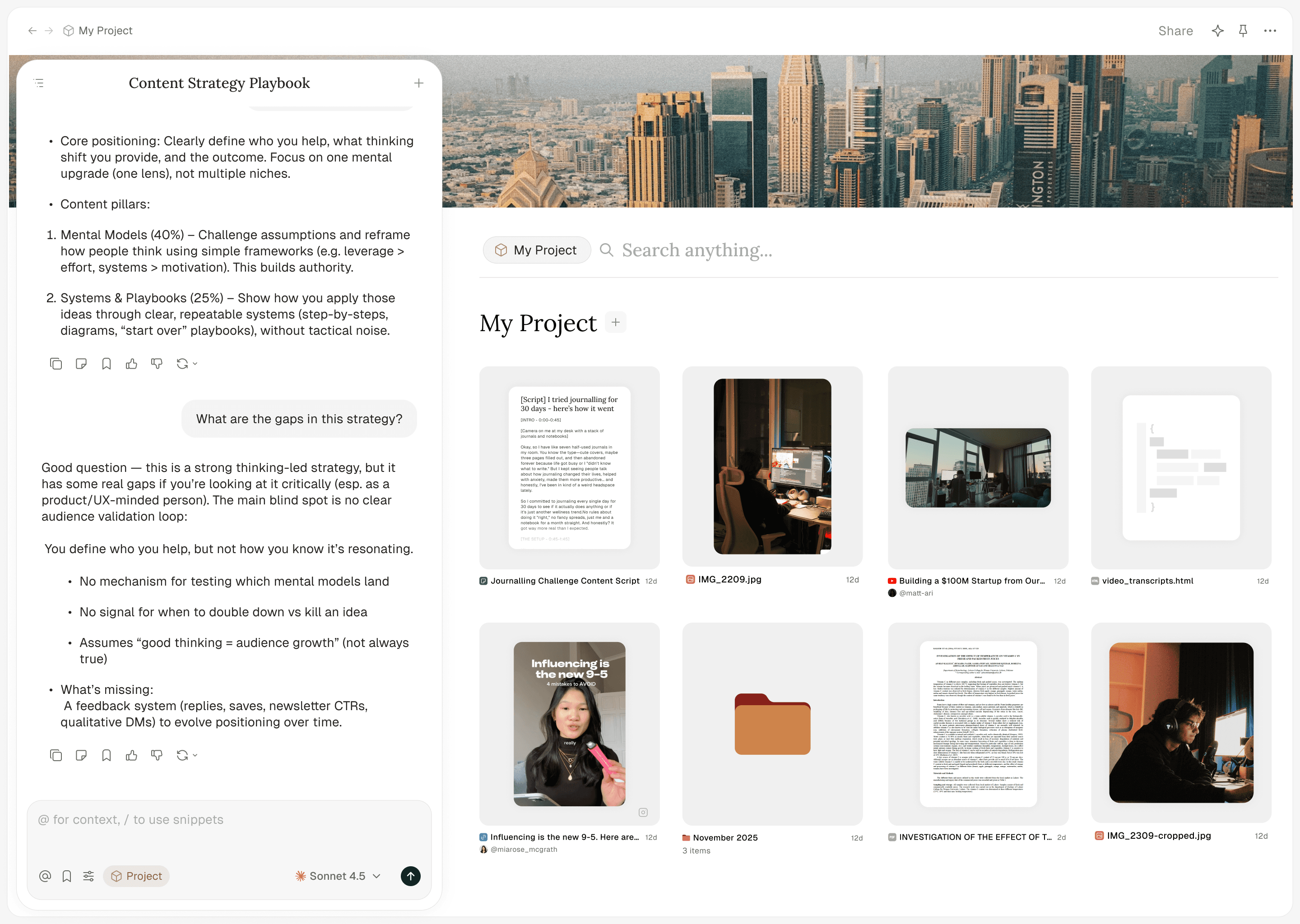 Add your files, docs, content, or videos to a project and work with it across multiple chats with shared context.